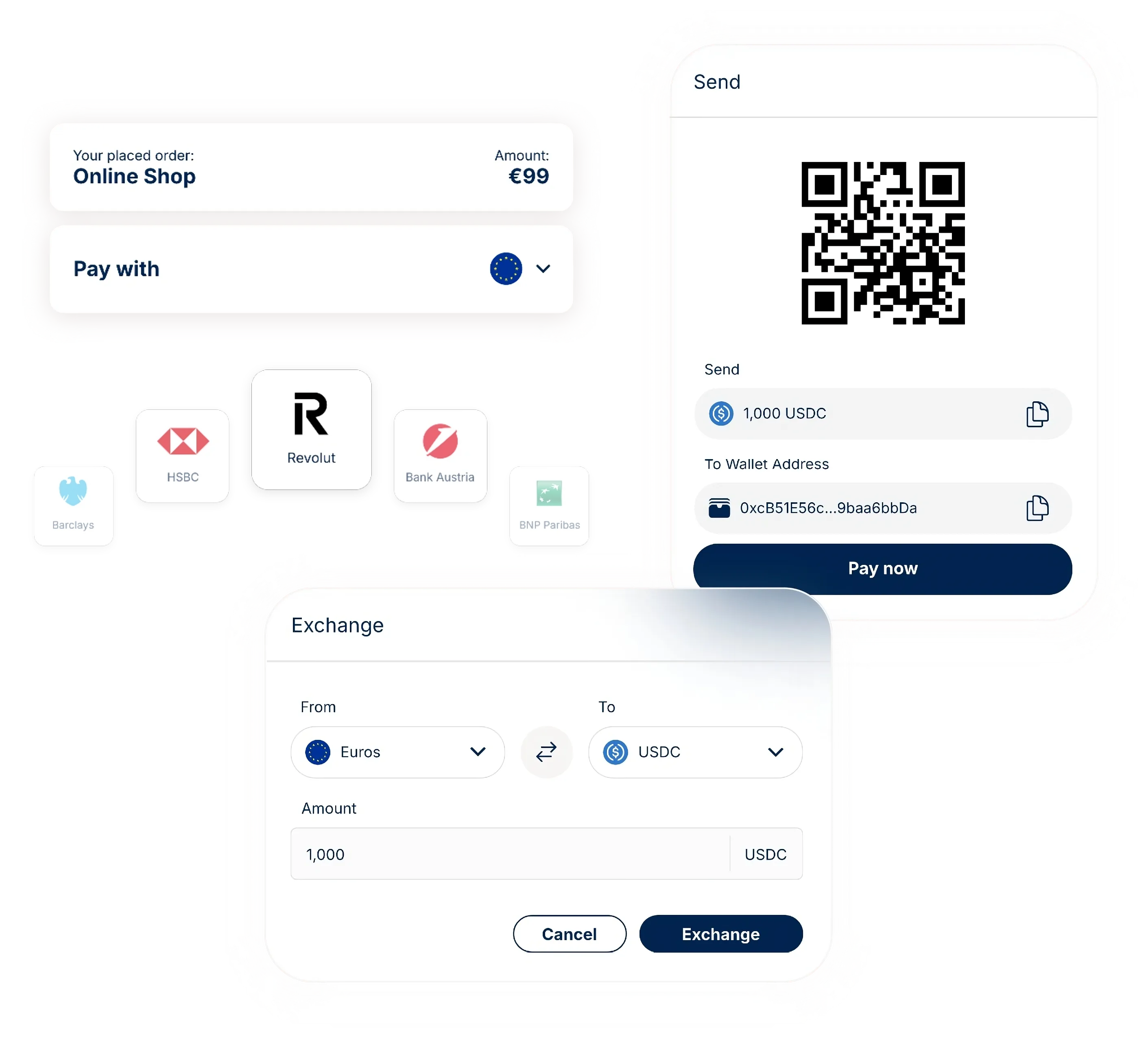 Accept payments via bank transfers, stablecoins, cards, and alternative payment methods (APMs).